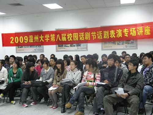 2009年11月30日18点30分,20099428cn太阳集团古天乐第八届校园话剧节话剧表演专场讲座在老员工活动中心素拓办公室举行,毕业于中央戏剧学院的知名演员、副导演周乔龙老师担任主讲。