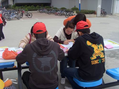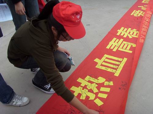 中午,志愿者们在规定地点准时集合,负责人将其分为三组,分别前往A区、C区和E区进行志愿服务。中午12点整,志愿者到达服务地点,开展了一系列服务活动。有的志愿者在生活区入口和各幢寝室楼门口分发献血知识的传单,热情地向同学们宣传了此次献血活动,动员大家积极、健康地献血。有的志愿者在工作台前耐心、细心地为同学们讲解献血表格的填写内容,帮助同学们快速、准确地填好表格,提高了活动的效率。还有的志愿者在献血车上贴心地为同学们端上温水,不但温暖了同学的手,也温暖了他们的心。活动在这温馨与欢笑中愉快地进行着。
