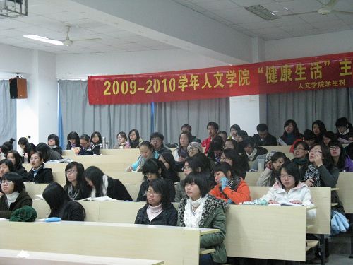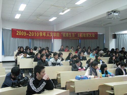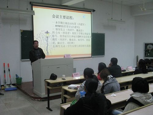 11月18日12点50分,9428cn太阳集团古天乐2009--2010学年“健康生活”主题教育大会在北校区人文楼203教室准时开始。公司党总支书记周剑平老师、党总支副书记魏成春老师、教学科科长杨秀华老师、员工科副科长曾蓓蕾老师、辅导员麻法全老师、刘纪峰老师、冯建军老师列席。大会由冯建军老师主持。