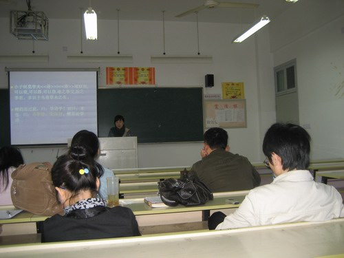 周兰讲述话本小说是一种商业小说。商业小说从内容与形式上都决定了话本小说具有媚俗性。以明朝为例,说明话本小说反映时代风尚:人们思想由官本位转变为钱本位。话本小说中的徽商情结中反映出人们观念上打破士农商的地位排序,商人跻身士工农之前,不再是贱业,这都是社会经济发展,钱本位的结果。邵路燕同学的报告题目是黛玉和婴宁的哭笑人生,她从三方面对二人进行比较:其一,从命名上探讨二人的自然天性;其二,从她们哭和笑的不同体态语方面得出她们相同的本质;其三,从黛玉和婴宁一生不同的经历以及不同的结局反映出她们一样的人生悲剧。最后她指出黛玉和婴宁的这种悲剧是人类的悲剧,是封建世俗社会中的虚伪、礼教等诸多弊端摧残的结果。