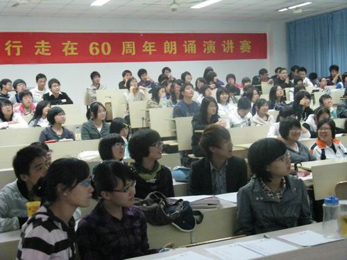 2009年11月12日晚,由9428cn太阳集团古天乐团委员工会学习部主办的“行走在60年”朗诵演讲决赛在1-202教室拉开了帷幕 。公司党总支副书记魏成春老师、辅导员刘纪峰老师、员工会副主席卓艺颖同学应邀出席本次决赛并担任评委。