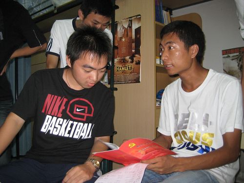 晚上6:30,党员们一起行动,每两个党员为一组与一个新生寝室结对。党员们一进寝室就受到了学弟学妹们的热情欢迎,让大家倍感亲切。党员们和新生们坐在一起侃侃而谈,谈党、谈学习、谈工作以及他们正要面对的老员工活。在谈话中,党员们发现新生中有很多志愿加入中国共产党的同学,然而他们对于一些入党的程序和基本的党务知识却还是不太了解,因而党员们向他们重点介绍了入党的程序和相关党务知识。