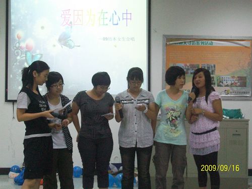 在优美的背景音乐声中,主持人登场,新老生联谊晚会准时开始。所有同学被随机分成以“喜羊羊”、“灰太狼”、“美羊羊”等名字命名的七组。第一个节目便是由09历本沈龚同学带来的歌曲《不再犹豫》,浑厚大方的歌声,让在场的同学们都沉浸在了歌声中;08历本的同学也不示弱,陈辉同学的京剧《空城计》令在场同学赞叹不已;09历本的班长冯佳梁同学为大家表演了神秘的纸牌魔术,让同学们为之惊叹;而08历本的潘晨霞同学与詹优同学合唱的《一个像夏天,一个像秋天》以及相孝锟同学和卜泽丹同学合唱的《小酒窝》同样也博得了大家的热烈掌声。为了更好的调动同学们的参与热情,也为了两个班的同学更好的了解,在每个节目之间分别穿插了《升级版抢凳子游戏》、《命运大转盘》、《弹珠接力》等精彩刺激的互动游戏,虽然室内感觉很热,但是大家的热情更高。整个晚会气氛热烈,欢声不断。吴剑波学长表示本次联谊十分地有意义,09历本的班主任助理余华燕同学还对09历本的同学们提出了殷切的希望。晚会在戴雅彬同学领唱的《相亲相爱一家人》的歌声中结束。