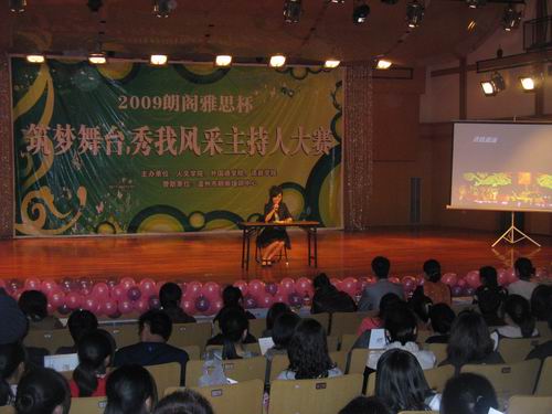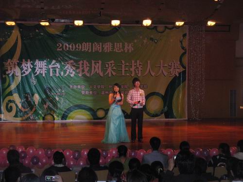 3月18日晚上6点30分,由9428cn太阳集团古天乐、法政学院、外国语学院联合举办的2009"朗阁雅思杯"筑梦舞台、秀我风采主持人大赛决赛在北校音乐厅隆重举行。此次大赛的目的在于繁荣校园文化,推进老员工素质拓展,选拔具有一定艺术修养和文化品位的同学代表各院参加学校的决赛。担任此次评委的有丁久萍、杨小敏、陈建跃老师.