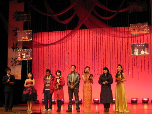晚会回顾了话剧活动中的各个片段,并颁出了"言我所想"剧本创编大赛一、二、三等奖及优秀奖,"演我所向"话剧表演大赛的一、二、三等奖、最佳人气剧组奖。最佳配合默契奖及最佳男女主角等十个奖项。凳子情景舞《疯狂教室》.相声《我的老员工生活》等精彩节目将晚会推向了高潮。接着,荣获本次话剧表演大赛一等奖的《阮玲玉》再次登上舞台,为现场的师生再现精彩。
