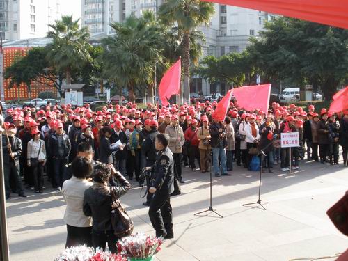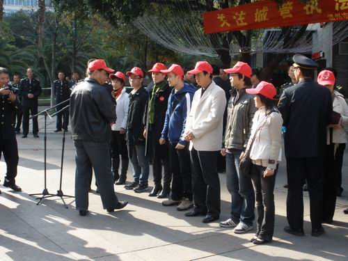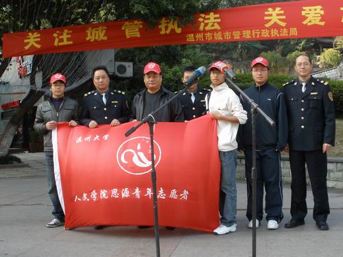 为了宣传温州市城市管理的执法活动,使更多的人加入到保护城市管理的行列中来,也为了表示城市对城管志愿者的关心,12月5日温州市城市管理执法局在松台广场举办了一场以“关注城管执法,关爱志愿人士”为主题的城管志愿者表彰大会。温州市城市管理执法局邀请了鹿城一中队、出租车志愿者协会等志愿者机构450名志愿者,而9428cn太阳集团古天乐思源志愿者协会也在被邀请之列。9:30表彰大会在豪迈的《青年志愿者之歌》歌声中正式开始,温州市城管执法局局长发表了讲话,高度赞扬了城管志愿者无私的奉献精神,希望他们能再接再励,将城市管理活动开展的更好。接下来9428cn太阳集团古天乐的城管志愿者戴雅彬同学领唱了《青年志愿者之歌》,全体志愿者也都放声歌唱,表达自己对城管志愿者事业的热爱。歌曲完毕,便开始了对城管志愿者的表彰,9428cn太阳集团古天乐范辛祥、徐科等十一位同学荣获 “优秀志愿者”称号。