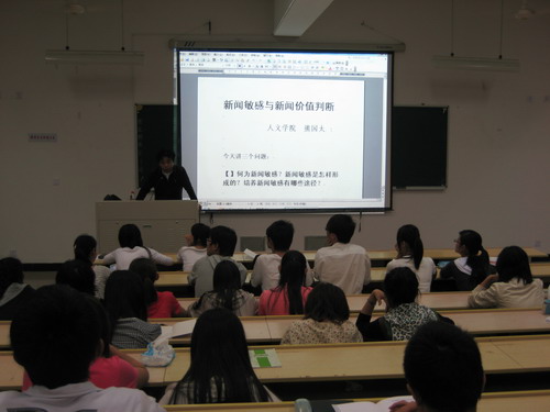 熊老师就"新闻敏感和新闻价值判断"问题拉开了培训的序幕,首先向同学们解释了"什么是新闻敏感",结合自己的观点,提出了对"新闻敏感"的理解,然后引出"敏感如何形成",指出"了解原来事实,发现新的事实,对原有事实和新事实之间的精细比较"是形成新闻敏感的最重要的方法,并通过对一个外国记者报道林彪飞机失事的具体事例来解释新闻敏感的形成。并且着重讲解了新闻敏感的培养途径,提出"加强政治修养和理论修养,及时学习和掌握党和政府的新政策和新精神;沉下身子了解熟悉最低层的情况,不断充实新的知识"才是培养新闻敏感的唯一途径。接着熊老师有指出了新闻价值的几个特征,让同学们在判断新闻价值的时候有所参考。
