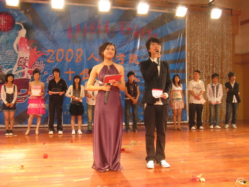 下午6时30分,音乐厅内早已座无虚席,在全场同学热烈的掌声中,决赛的帷幕徐徐而开。学院邀请了董博等评委,并请来了茶山声海琴行等进行嘉宾演出,他们的到来为这次比赛增加了不少亮点。选手们精彩的出场秀表演点燃观众们的激情并将晚会气氛推向了第一个高潮。而后参赛的十五位选手各自演唱了自己最为拿手的歌曲,唱出了青春的激情和绚丽,赢得了在场老师和同学的阵阵喝彩。其中,来自08中本 本3班的孟文苗同学以一首《美丽心情》获得老师和同学的一致好评,得到了9.75分的全场最高分并最终捧回一等奖。08历本的相孝锟和05中本1班的徐利光也紧随其后分别获得二三名。十五位选手用自己青春的歌喉演唱着每一首动听的歌曲,那优美的旋律奏响了老员工对未来的憧憬、向往。台下的观众激情回应着那悠扬的旋律,歌声与热烈的欢呼声久久回荡。 随着每个跳跃的音符,在比赛进入尾声之时,特邀嘉宾声海琴行的双吉他弹唱为晚会画上了完美的句号。
