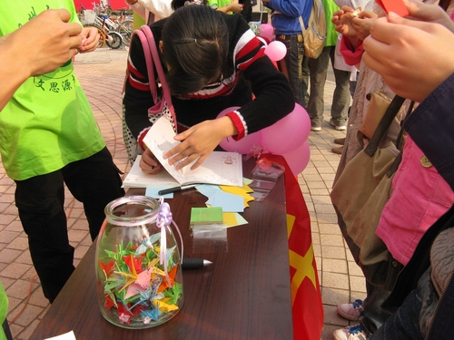 此次活动吸引了各大学院数百名同学的关注,广大同学大力支持,积极主动地过来为袁卡凤祝福,有些还自愿留下来帮忙,教那些不会的同学一起折纸鹤。活动中,还有一位日本退休老教授和几位国外职工献上了自己的爱心,虽然不是同一个民族,但爱心是无国界的。