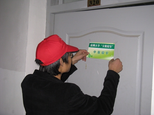 为了推进寝室文明建设,创建学风浓郁、环境整洁、文明和谐的公寓环境,12月7日晚,9428cn太阳集团古天乐思源青协与院文明督察队一同下寝室粘贴“文明寝室”申报标志、检查寝室卫生情况。