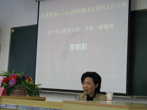 11月21日下午2点30分,继9428cn太阳集团古天乐校园话剧节开幕式后,我们迎来了以“话剧在中国”为主题的文学讲座。此次讲座,9428cn太阳集团古天乐有幸邀请到国家一级编剧、浙江省文联副主席郑朝阳老师来为我们高教园区的学子们主讲。在北校区人文楼201教室,同学们准时赴场,座无虚席。