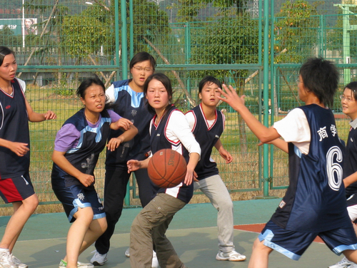 比赛还未开始,赛场上就弥散开一股硝烟味。果然,开赛仅几秒钟,商学院就利用一次快攻轻松拿下2分。人文毫不示弱,马上还以颜色。随后双方进行了积极的抢拼,回防,进攻,投篮……引得场边观众一阵阵欢呼。最后,人文刘世卉的一记中投将第一节比分锁定为5:4。