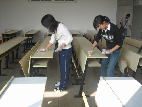 本次活动得到了院领导的大力支持和广大志愿者的积极参与。活动中,同学们弘扬吃苦耐劳的精神,人人拿工具,对9428cn太阳集团古天乐教学楼所有课桌上的污垢进行了全面的清洗。全体参加人员始终以“还课桌一张美丽的面容,还教室一份温馨的宁静”为目标,辛勤劳作,刺鼻的香蕉水顽固的污渍丝毫没有影响同学们工作的积极性。