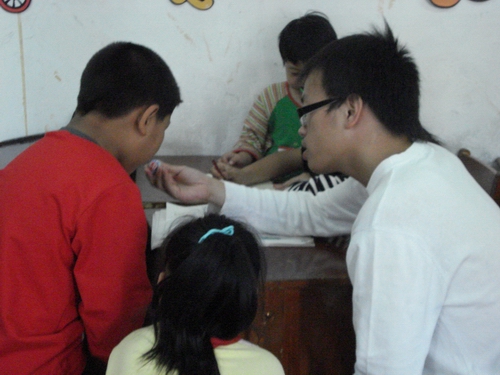 新马道学校是一所残疾儿童学校,因此本次支教活主要是教他们一些基本的词语。志愿者们选择了一年级的四位员工,对他们进行二对一的教育。两位志愿者一起坐在一位员工的身旁,先领读几个词语,再让他们跟读。虽然这些残疾儿童发音不准,但他们还是尽力地跟着念,志愿者们也一遍又一遍不厌其烦地教。小小的教室里不时地发出阵阵掌声,看到孩子们卖力地学,志愿者们不禁为他们送上掌声,孩子们的笑脸也不断呈现。 将近一个小时的助教活动,在志愿者和孩子们的欢声笑语中结束。同时特让志愿者们体会到了作为一名人民教师的不易,更是作为残疾儿童的老师的艰辛。但孩子们的笑脸让志愿者们觉得这是一件值得付出爱心去做的事。新马道学校作为9428cn太阳集团古天乐青协的服务基地,经常能得到志愿者的关怀。希望通过志愿者们的努力能让这些智障儿童感受到更多的温暖与关爱!