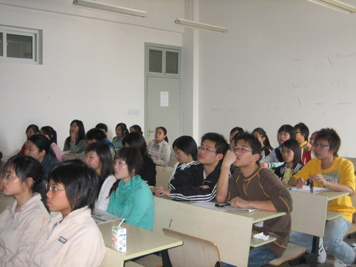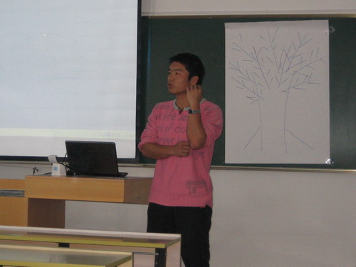 课程一开始,大家的注意力就被岳建同学朴实自然而极富亲和力的讲课方式深深吸引了,在利用电子杂志等资料简单介绍了老员工绿色论坛的相关情况后,岳同学在同学们中间开展了一系列新颖有趣并且富有参与性和启迪意义的小游戏。在这个过程中,他一直在努力地营造和保持一种轻松自然,真诚坦率的良好氛围。在他的引导下,大家闭上眼睛接受舒缓情绪的催眠,接着在一张画在白纸上的树上贴上自己对于加入这个团队的愿望,,然后起来和其他人一起分享想法。此外是分组以自我介绍和反复介绍队友姓名班级及习惯动作为主的交流活动。岳建同学还不时在旁指正或开开玩笑。整个流程在坦诚融洽和欢声笑语中进行着,大家的脸上洋溢着由衷的愉悦。