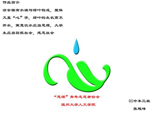 大众评委和嘉宾评委所选出的会徽图形设计作品都紧紧扣住本次活动的主题,同时也十分注重作品的创造性。作品突出“人文”“思源”“志愿者”,即任何一位志愿者都应积极无偿地参加一些社会公益活动,思源不忘本,以自己的爱回报社会,发扬志愿精神和公益精神,传递人文关怀,让爱的足迹绵绵不决。