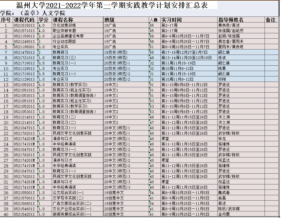现将本学期实践教学安排表上传,请老师、同学们下载,并做好实践安排和计划。