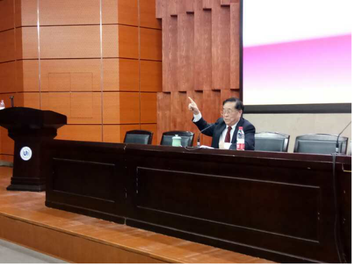 活动进入第二个环节,由曾担任过外交公司党委书记、常务副经理的袁南生教授做主题演讲“走进世界的中国外交智慧”。袁教授语言幽默风趣,表述清晰易懂。他以“五”为支点,给各位与会者详细讲解了我国外交在面对例如我国大使馆如何应对美国制裁津巴布韦、与穆加贝总统参加北京奥运会前后事宜、韩亚空难以及处理津巴布韦粮食援助等“五大考验”;促进中国与津巴布韦的佛教交流、号召在津华侨华人收养艾滋病孤儿、建立苏里南华人华侨社团联合总会、推动中国春节成为苏里南法定假日,以及妥善解决在苏里南非法入境的华人问题的“五大善事”;并以此提出要培养大国公民心态、敢于创新、勇于担当、灵活变通、注意细节“五点思考”。袁教授表达流畅有趣,其话语中彰显出的大国气量与大国智慧,令会场中时不时响起崇敬与骄傲的掌声,现场气氛极其热烈。为本次公共外交走进高校系列活动启动仪式画上了圆满的句号。