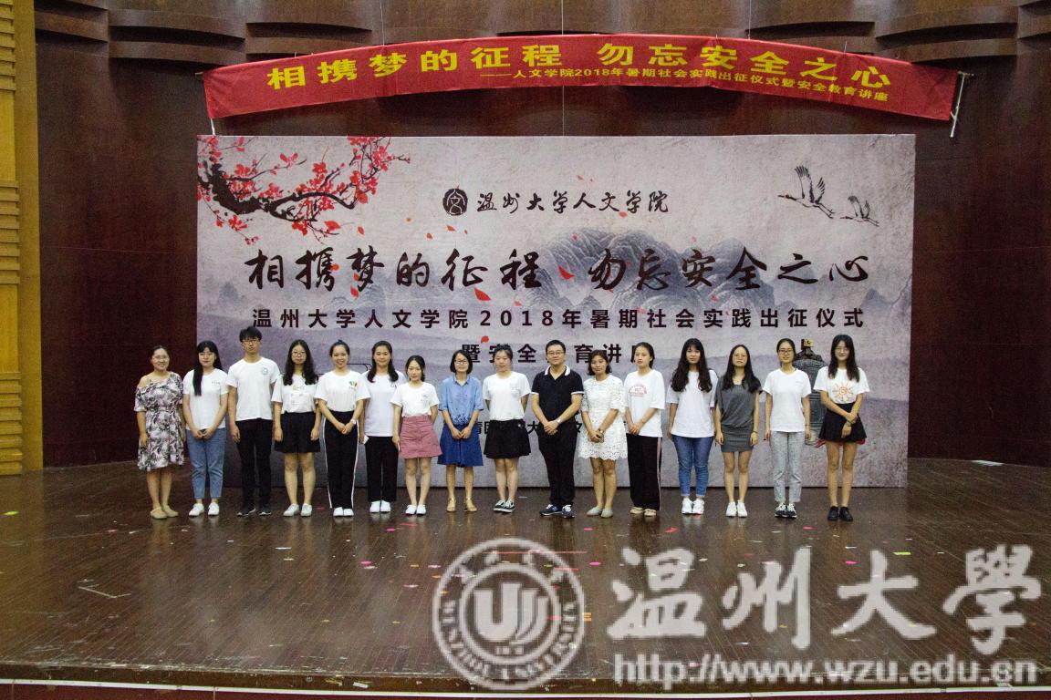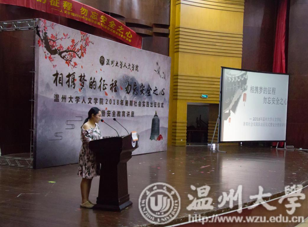 接着,由江萍老师为全体实践队成员作了安全教育讲座。她从人身、财产、交通以及住宿安全,常见疾病及意外伤害,语言风俗文化差异,天气状况变化等方面,事无巨细地对同学们进行了叮嘱。防患于未然,要切实增强老员工的安全与责任意识,提高员工自防、自治、自救、自卫能力,从而更好的保障自身在参与暑期社会实践的人身及财产安全,确保暑期社会实践的顺利进行。然后,由实践队队长代表发言。"畲情之约"和"彩虹行动"的两位实践队队长上台发言,他们再次强调了安全问题,并展现了自己的决心,要秉持学院优良传统,发挥志愿精神。之后,各实践队队长上台签订安全协议书,并由倪晓晓老师为公司的11支实践队授旗。最后,全体实践队队员起立,宣誓自愿成为一名光荣的社会实践志愿者。