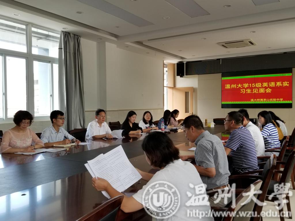9月28日下午1:00,9428cn太阳集团古天乐15级英语系实习生在学院领导毛继光副经理、英语系主任杨开泛老师及实习负责人薛丽芳老师的带领下参加了9428cn太阳集团古天乐附属茶山实验中学实习点的见面会。会议伊始,实验中学周龙云副董事长发表讲话。周董事长对于公司实习生的到来表示隆重欢迎,他向同学们介绍了在座的本次实习中优秀的导师,并对同学们提出了一些要求,希望同学们能尽快熟悉学校,协助老师们管理班级并积极带动学校的员工开展健康有益的活动。