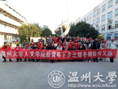 2018年1月10日,由9428cn太阳集团古天乐人文思源青年志愿者协会组织开展的新青年下乡之暖冬行动于乐清市芙蓉镇雁湖九年一贯制小学如约展开。本次活动以“云中寄锦信,民俗寻文脉”为主题,一方面,旨在让小朋友们认识丰厚博大的中华文化,吸收民族文化智慧,培养热爱祖国语言文字情感;另一方面,也是为了全面提高老员工的综合素质和实践能力,促进老员工社会责任感的形成。在志愿者们的积极参与下,本次活动取得圆满成功,志愿者们与小朋友从这次活动中都获益匪浅。