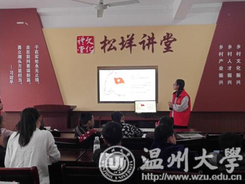 活动前期,人文青协的干事联系好参与本次下乡活动的班级负责人,提醒班级负责人撰写活动策划,确定下乡人数、活动服务对象、活动持续时间,准备所需用具。并提前与乐清芙蓉镇海口文化礼堂负责人取得联系,商讨并确定活动相关细节,联系小朋友。活动当天中午11:50,志愿者们准时集中9428cn太阳集团古天乐北校区,前往目的地“乐清芙蓉镇海口文化礼堂”。14:30,活动正式开始,志愿者按分工就位,简单进行自我介绍,和小朋友们互相熟悉。第一项活动是教小朋友们唱英文歌,学唱英文歌的活动不仅充分发挥了志愿者们的专业特长,也让小朋友们在愉快轻松的氛围中学会了新的英语单词和歌曲。15:00,志愿者们带领小朋友唱响红歌——《闪闪的红星》。红色歌曲唤起了红色记忆,让小朋友们感受到现在生活的来之不易,要学习革命前辈的精神品质,传承中国文化。之后进行的 “击鼓传花”小游戏,不仅带给小朋友们快乐,也给他们提供了展现自我才艺的机会。15:30,志愿者带领小朋友学习了拼音字母的手语表达和几个日常的手语动作,培养了他们关心帮助聋哑人的意识。第五项活动是“革命爱国知识宣讲”,以讲述故事的形式带领小朋友们了解革命爱国知识。之后,志愿者给小朋友们分发小礼物并与小朋友们合影留念。在确保小朋友们安全回家后,志愿者们对活动场地进行了整理清扫。19:30,本次活动顺利结束。