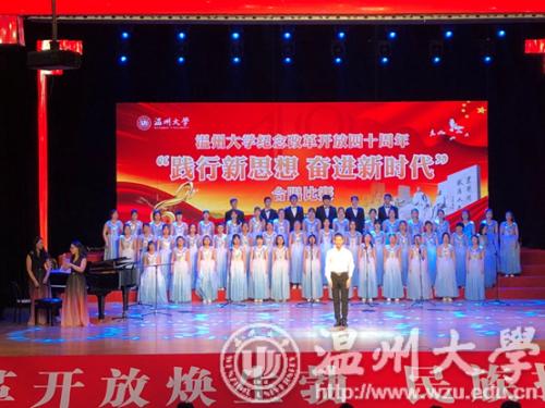 本次比赛按照改革开放四十周年的历史时间顺序分为了三个篇章,分别是第一篇章:改革之风,第二篇章:春天的故事以及第三篇章:不忘初心。来自17个学院的代表队参加本次比赛,《黄水谣》、《青春的旋律》、《爱我中华》、《祖国不会忘记》、《不忘初心》等昂扬豪情的歌曲不仅倾诉了温大学子热爱共产党、热爱祖国的心声,也表达了新时代青年员工对中国踏上富强征程的美好祝愿。豪迈嘹亮的歌声回荡在育英大礼堂,连空气中都满是壮志昂扬,引起台下观众强烈共鸣,整场比赛掌声不断,经久不息。