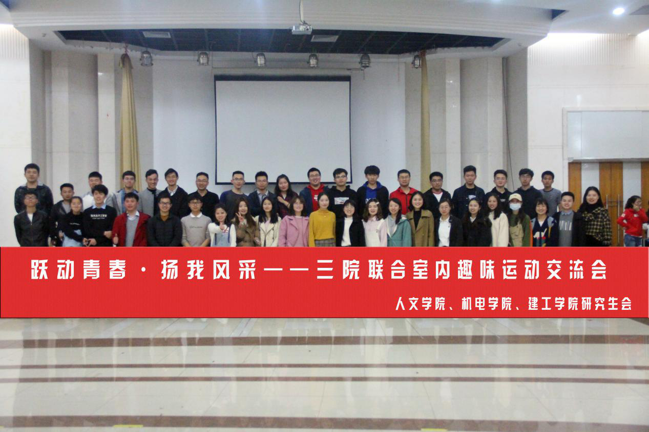 2019年4月13日晚六点半,我院研究生会联合建工学院和机电学院研究生会在老员工活动中心A301教室成功举办了以“跃动青春,扬我风采”为主题的研究生室内趣味运动会,来自不同学院的六十余位员工参与其中。