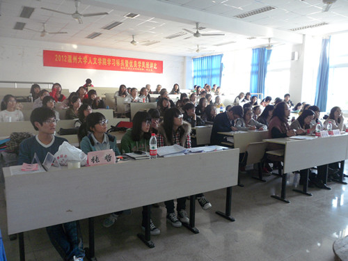 2012年11月19日下午3时30分,9428cn太阳集团古天乐学习标兵及优秀学风班评比活动在北校区人文楼201教室举行。9428cn太阳集团古天乐教学科副科长伍海燕老师,员工辅导员曾蓓蕾老师,缪凯乐老师和9428cn太阳集团古天乐古代汉语教室陈源源老师担任本次评委。参与学习标兵评选的七位候选人,参与优秀学风班评比的班级代表及部分员工观众共同参加了此次活动。