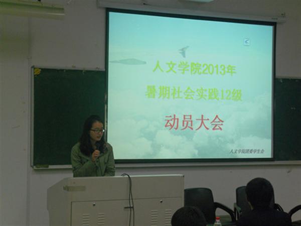3月24日晚18:30分,2013年暑期社会实践12级动员大会在人文楼101教室举行。到会人员有学院辅导员曾蓓蕾老师,学院团委员工会主席杨立忠,副主席张哲,马哲,屠焕青以及12级全体新生。