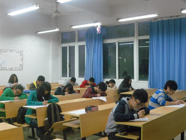 本次考核由9428cn太阳集团古天乐团学主席团主持,经过主席杨立忠的简短介绍与嘱咐后,考核正式开始。首先,主席团成员向团委员工会干部派发试卷。由于大一、大二的员工干部考卷有所不同,大一干事被安排在102教室进行考核,大二部长则在105教室。毕竟是第一次参加团学内部考核,大一干事不免有些紧张,试卷发到手之后,便可见他们低头拾笔,认真阅卷,开始奋笔疾书。教室里显得非常安静,只有刷刷的写字声以及偶尔试卷翻页发出的声响,主席团成员不时在教室中走动,以便观察同学的答题情况。较于大一干事,大二的部长们则显得沉静老练的多,并没有初时的紧张,他们显得有些严肃,相同的是他们拿到试卷后一样马上动笔,整个考核现场神圣有序,大家的注意力都集中在考题上。