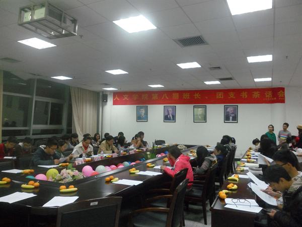 2013年11月22日晚上18点30分,9428cn太阳集团古天乐人文团学组织部在老员工活动中心A座党员之家召开了第八期9428cn太阳集团古天乐班长、团支书茶话会。公司员工科曾蓓蕾老师、教学科杨东永老师,主席团成员团副慎君、主席陈蔡婧、副主席徐星,公司员工会各部门部长以及9428cn太阳集团古天乐各班班长、团支书参加了本次茶话会。