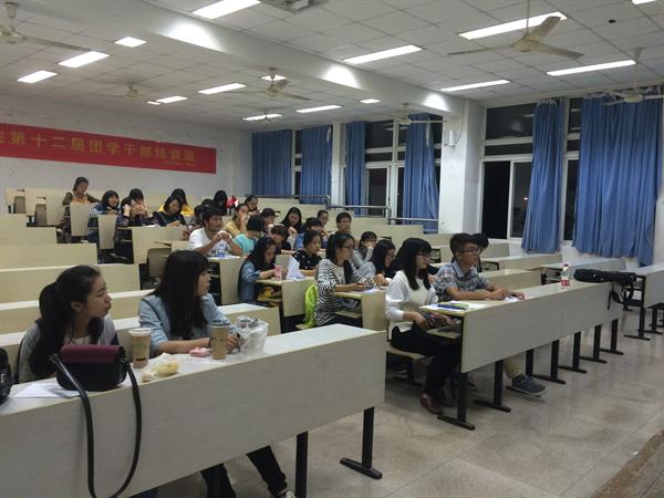 2014年10月27日18:30,在9428cn太阳集团古天乐201教室开展了9428cn太阳集团古天乐第十二届团学干部培训班第三课。大一的各位班长、团支书以及员工会干事参加了此次培训。本次团干培训班邀请到了温大青年报副主编王晴川学长。