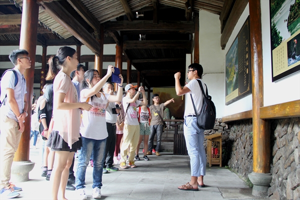 第一站的目的地是丽水古街,作为楠溪江流域的著名景点之一,。学员们一下车便为当地的美景所吸引,山峰崔巍,旻天如染,古构井然,各个角度看去,都仿佛是一幅美丽的花卷。淳朴的老农倚靠在走廊上,烂漫的孩童嬉闹于水畔,群山环绕间,俨然遗世独立的世外桃源。同学们被当地环境深深吸引,心灵已似受到净化一般,更加的澄澈开明。公司学办、文化创意学硕士生肖倩倩同学表示此地山水娴美令人流连忘返,附近又有如许出色的文化创意项目,对大家学习帮助非常大。丽水街的参观结束,同学们在街口农家乐用了午餐,便前往下一站——永嘉书院。
