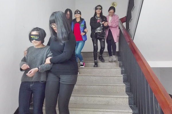 接下来的游戏“盲行”则让气氛更加活跃。同学们两两搭配,一位头戴眼罩,另一位则负责保护同伴的安全从教室到楼上绕一圈,并相互交换身份。体验结束后,朱老师让大家分享感受,同学们都十分积极地发言,在大家面前分享了自己与众不同的感受,如“团队合作的关键在于无条件的信任和被信任”,再如“在朋友面对困难时,与其一味地告诉他不要害怕,不如给他一条克服恐惧的方法”等等。