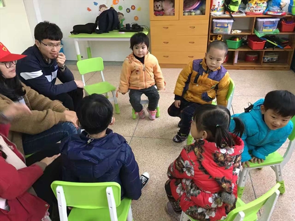 游戏组此次以识别图画为主要内容,先由志愿者对小朋友进行一对一的图片讲解,教孩子们发音。每一次发音都非常艰难,孩子们也很努力,志愿者一遍又一遍地重复着一样的话语,为的就是孩子们口中的一句模糊的咿呀。之后,志愿者们利用教室内的多媒体进行动画儿歌放映,所有人手拉手围成圈唱歌跳舞,一首又一首儿歌不断唱着,而快乐,也不断持续着。