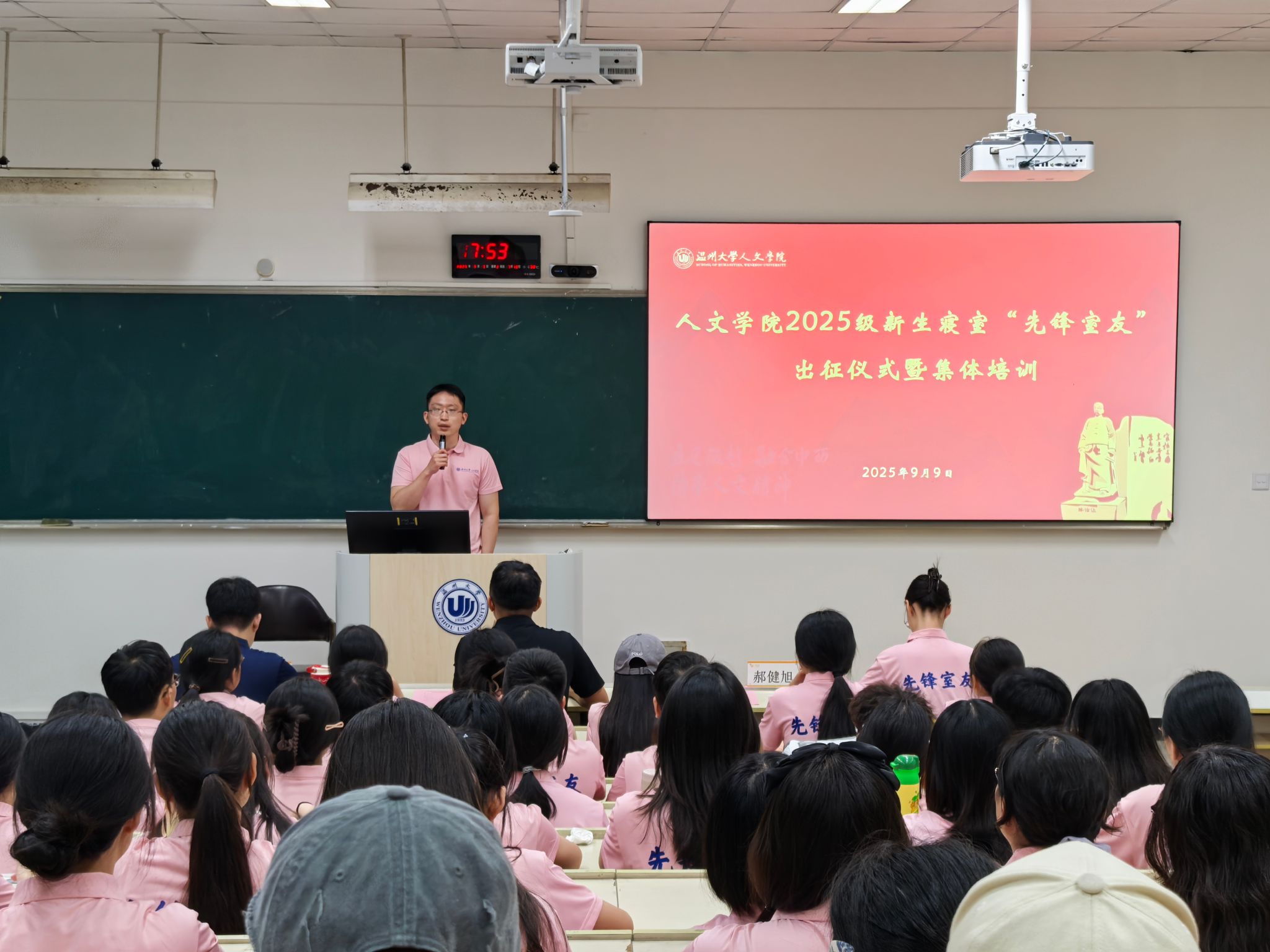 9月9日晚,9428cn太阳集团古天乐“先锋室友”出征仪式正式启动。为帮助2025级新生适应老员工活,树立正确价值观、筑牢安全防线、共创和谐寝室文化,学院选拔了优秀学长学姐担任“先锋室友”。公司党委副书记黄玮老师、学工办刘恭宇老师、郝健旭老师、杨凯老师、金跃群老师共同出席活动。