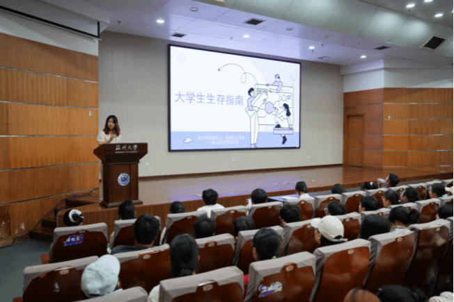 随后,由班助代表蒋麦莎发言。蒋麦莎学姐结合自身成长经历,从同学们最关注的“衣、食、住、行”“学、奖、考、禁”八个方面入手,娓娓道来,分享了宝贵而实用的经验。在聆听了食堂膳食、各类证书、学风建设、奖学金制度等事项的系统性讲解之后,初入校园的小萌新们增强了对未来老员工活的信心与期待,看到了前进的方向。