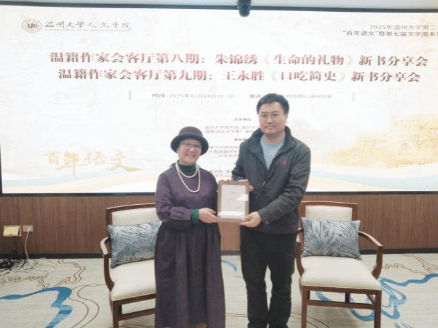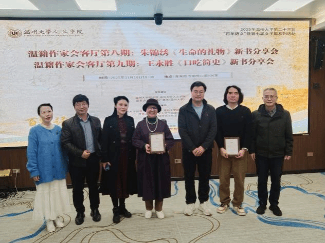 活动尾声,孙良好教授为朱锦绣、王永胜颁发“温籍作家会客厅特邀作家”聘书,全体合影留念。本次分享会在温馨的氛围中落幕,两位嘉宾的人生故事在打动与会师生的同时,也带来了对“热爱”“真诚”与“生命价值”的更深思考。