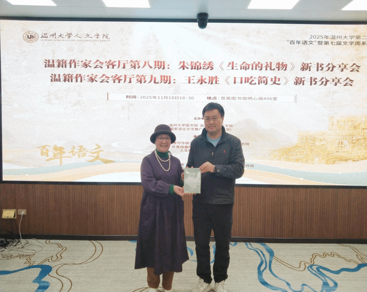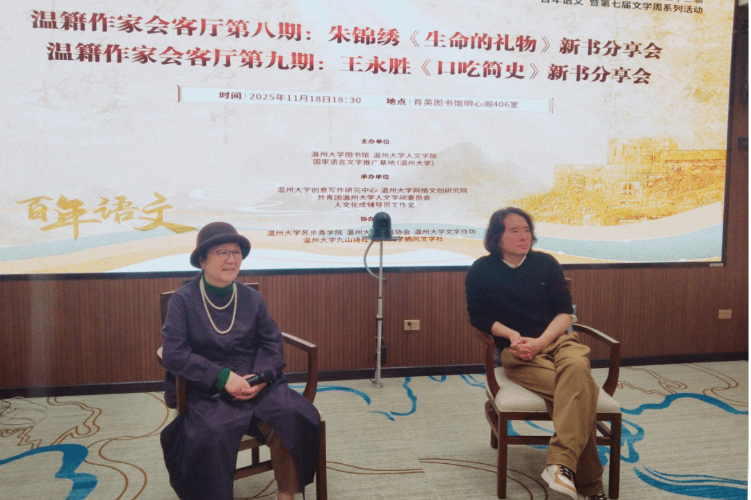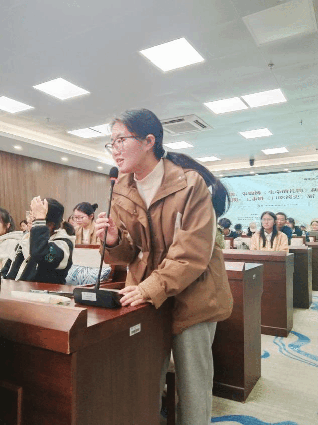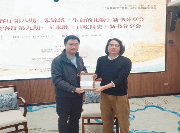 活动伊始,现场举行了新书捐赠仪式。朱锦绣女士捐赠《生命的礼物》,王永胜先生捐赠《口吃简史》《屠龙简史》,师生代表共同参与这场兼具文学温度与生命深度的交流。