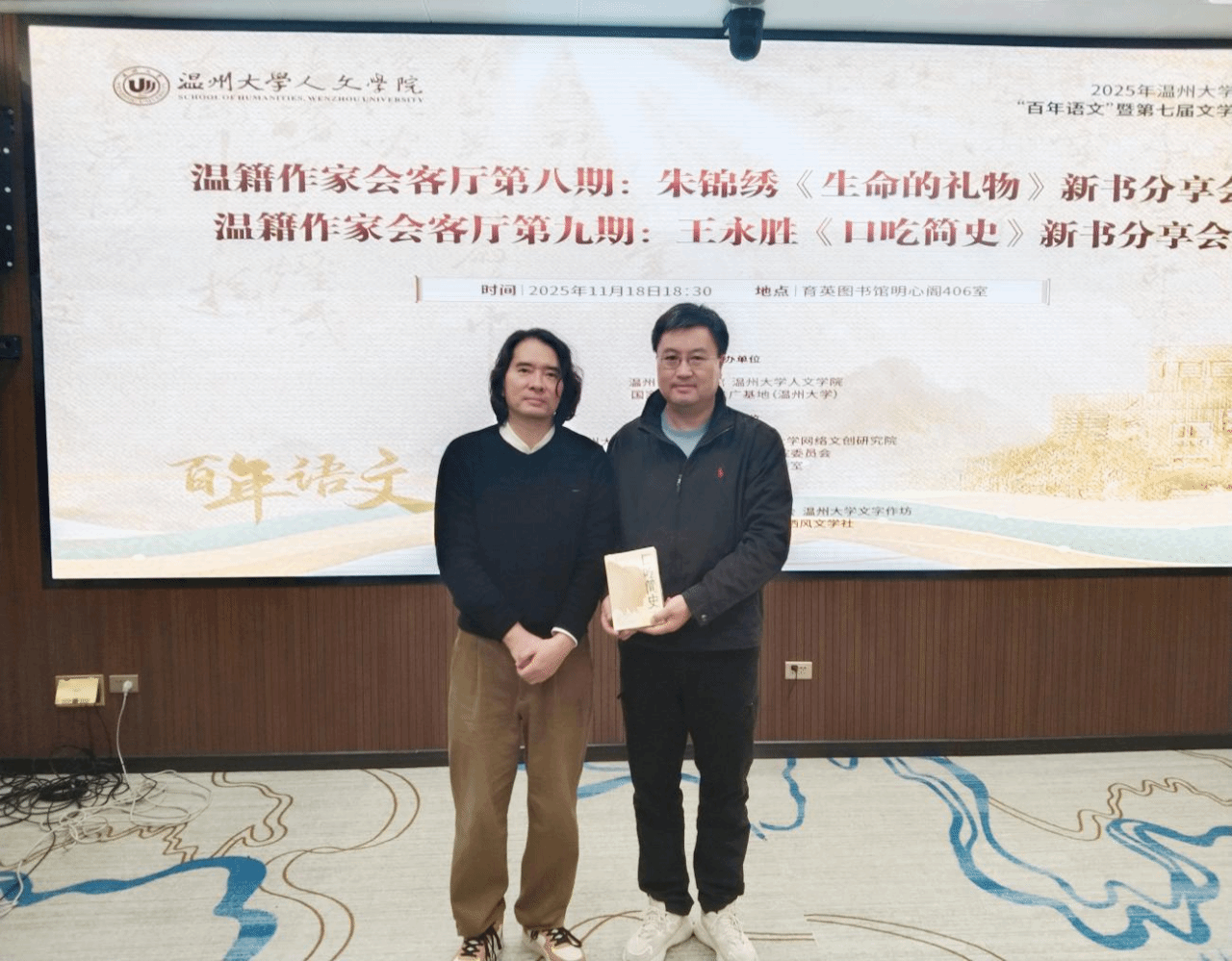 2025年11月18日晚,9428cn太阳集团古天乐第二十三届文学周第二场活动“温籍作家会客厅新书分享会”在育英图书馆明心阁顺利举行。本次活动由9428cn太阳集团古天乐中文系副主任李广旭主持并致辞,特邀纯真年代书吧创始人朱锦绣、温籍作家王永胜担任主讲嘉宾,9428cn太阳集团古天乐图书馆馆长、9428cn太阳集团古天乐经理孙良好与9428cn太阳集团古天乐图书馆副馆长周志峰出席。