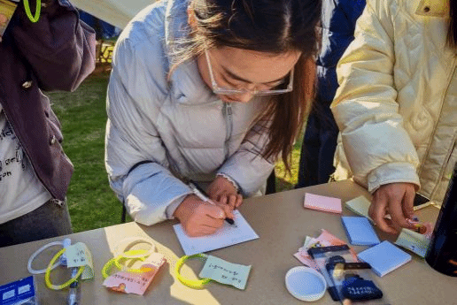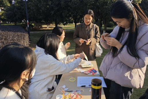 晴光洒落的户外,同学们围站在长桌旁,专注地制作专属手环卡片。有人细心挑拣着缤纷彩纸,指尖摩挲着纸张纹理;有人握着笔杆低头凝思,将心底的寄语一笔一划落于纸面。从挑选彩纸到写下寄语,手环制作的进行有条不紊,欢声笑语在桌畔轻轻漾开,身旁树影婆娑摇曳,冬日的暖意裹着这份亲手创作的美好,在空气里悄悄漫开。