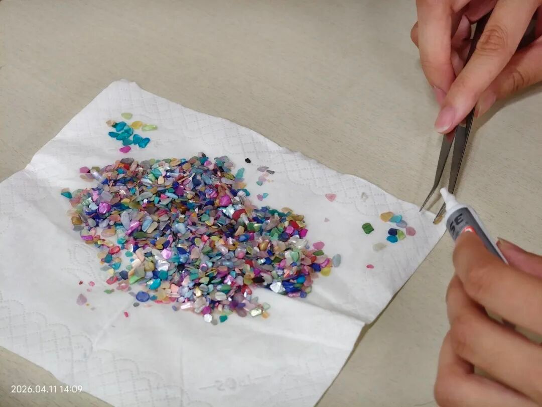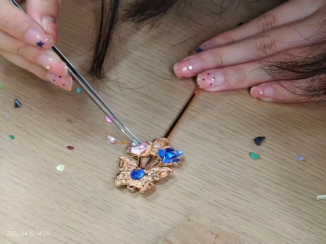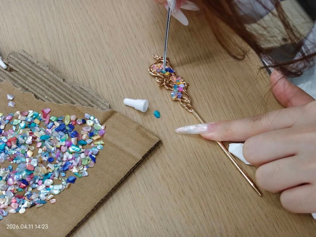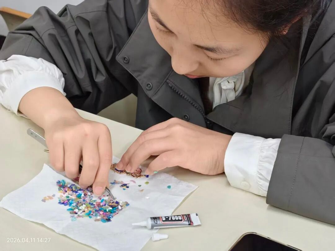 手作实践中,同学们在在金属簪杆上创意构图,用镊子轻夹螺钿薄片,细心粘贴、填充缝隙、涂抹封层。一片片带着珠光的贝壳,在指尖化为清新花卉、简约纹样、雅致扇面等别致造型。大家沉浸创作,相互交流技巧,在慢时光里完成了专属螺钿发簪,将春日诗意与非遗之美定格于作品之中。