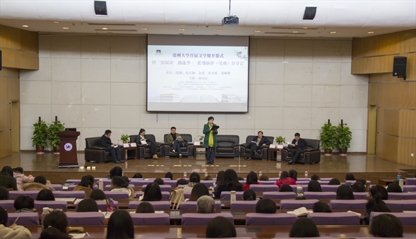 随后,嘉宾们做了细致而深入的分享发言。朱寿桐教授说道,这部作品写出了在巨大灾难面前符合人性的最直接而深刻的感觉,这是人性的意念,人性的悸动,不能用价值理念去衡量。他认为,张翎女士的作品用人性去拥抱人物,而不对人物的思想情感做出价值的判断,这是最可贵的地方。金进教授则从纯学术的角度,讲到新时期文学的发展过程,“身体与记忆”在作品中的体现以及鬼魂叙述的特色。在创作的特点与技巧方面,朱文斌教授分享说,互文性、多声部是作品中两大突出的特点,这种特点的形成与张翎女士在海外的经历是密切相关的。正是东西方文化的交融,赋予了作品更宏大的意义。董琳璐博士有感而发,她在《劳燕》中看见了家庭叙事角度的突破及特别的“双城记”叙事角度,注意到作品中对异域文化和小人物的命运的关注。文学大咖们畅所欲言,碰撞出思想的火花,使在座来宾从多角度认识了《劳燕》,认识了张翎。最后是张翎女士与同学们的对话环节,作为本书作者,张翎女士以最易懂的口吻、最真实的感悟回答了同学们的问题。本次分享会在意犹未尽中拉下帷幕。