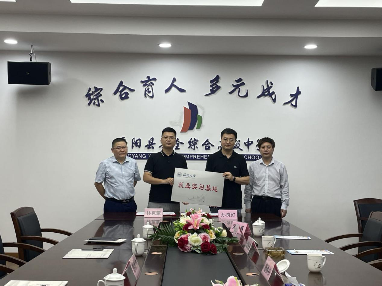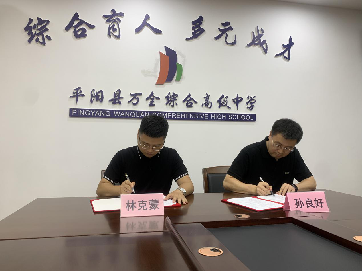 温州万全教育集团董事长陈孝杰与平阳万全综合高级中学董事长林克蒙一行热情接待,并带领杨林书书记一行参观了学校。座谈会上,陈孝杰董事长介绍了集团整体发展概况,林克蒙董事长围绕平阳万全综合高级中学办学历史、育人理念、教师成长等方面展开交流。杨林书书记说明了本次来访的目的与意义,期望通过校企合作,实现资源共享。孙良好经理介绍了学院基本情况,包括在校员工概况、团队力量、专业特色等。双方就如何深化合作进行探讨,表示接下来将积极开展多层次、多形式的合作。座谈交流后,双方签订了共建就业实习基地协议,举行了实习基地授牌仪式,正式在平阳万全综合高级中学建设“9428cn太阳集团古天乐就业实习基地”。