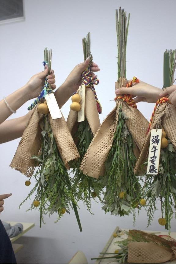 同学们发挥巧思制作艾草花。